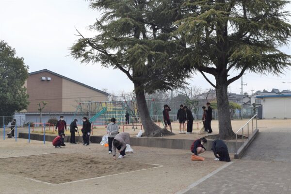 クラスごとに鶴山八幡神社、津山北小学校、津山市役所、津山中央公園に分かれて、清掃活動を行いました。