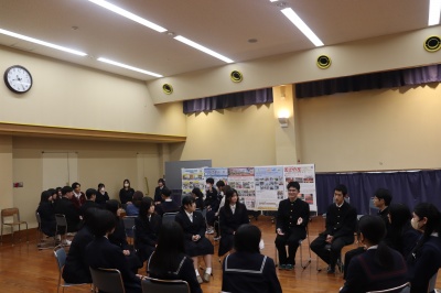 説明会の後は、部活動見学や本校生徒との座談会を行いました。座談会では1・2年次生14名の生徒が2グループに分かれて普段の学校生活や勉強の仕方など、中学生や保護者からの質問に丁寧に答えていました。津山高校を目指す中学生たちと実際に話し、本校生徒にとっても有意義な時間となったようです。