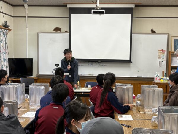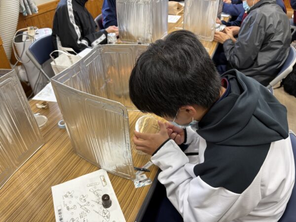 培養実習ではエリンギやマイタケ、シイタケやムキタケなどを培養プレートに殖菌し、持ち帰ることができるように行いました。牛島先生による丁寧な説明もあり、生徒は好奇心旺盛に取り組んでいました。