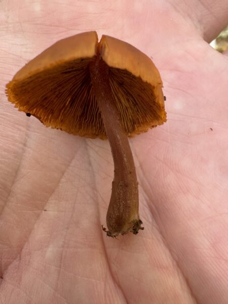 ・「キノコ」というものが1つのカテゴリーとして、形やにおい、生息地域などいろいろな種類があるとても深い存在だということを感じました。林の中を探し回ってみると、草木の中にまぎれて様々なキノコを見つけることができました。キノコそれぞれに住みやすいや環境や繁殖のしやすさなどの理由からここに生息しているのかな等と考えると面白かったです。大きな森林の中で「キノコ」だけを目当てに探すというのはとても大変でしたが、木陰の日常では見ないようなところをじっくり探し歩くのはとても楽しかったです。また、キノコの培養実験は私にとって、今までに行ったことのある生物の実験観察の中で最も「研究者みたい」だと感じられるものでとてもワクワクしました。無菌状態を常に意識し、観察物だけでなく、道具や環境にまでにここまで配慮した実験は初めてだったので貴重な体験になりました。数日、数カ月後どのような様子になるのかがとても楽しみです。家の近くや登下校路などの身の回りにあるキノコにより興味をもって生活していきたいと思いました。
