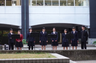 11/17(月)の放課後、合唱部が中庭コンサートを行いました。新たに新入部員も迎え、8名でアンコール含めて全4曲を歌いました。秋から本格的に冬に移り変わろうとする澄んだ空気の中庭に、合唱部の歌声が響き渡りました。