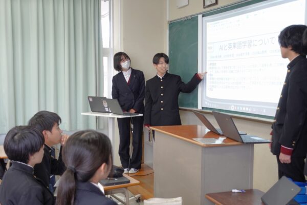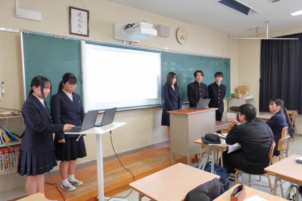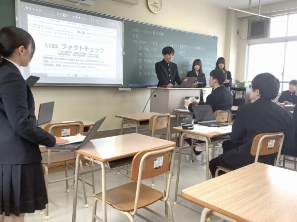 写真のグループの研究テーマは、「LGBTQに関する制度 日本とノルウェーの違いについて」、「複数のフェイクニュースから共通点を見つけ出して見抜くポイントを考察する」、「AIと英単語学習について」、「津山高校1年次生の人格と趣味からマーケティングを考える」でした。