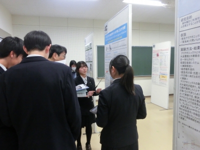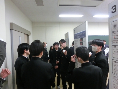 今回参加したのは, 理数科2年次生の課題研究7班です。生徒たちは, 審査員である大学の先生方に自分たちの研究を楽しそうに説明し, 質問に誠実に答えたり, 議論したり, 助言をいただいたりと, よく頑張っていました。また, 他校の班の発表を聞いたり, 質問をし合ったりと, 交流も深めることができました。