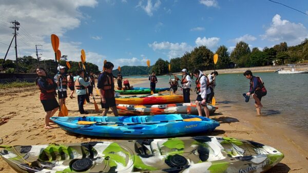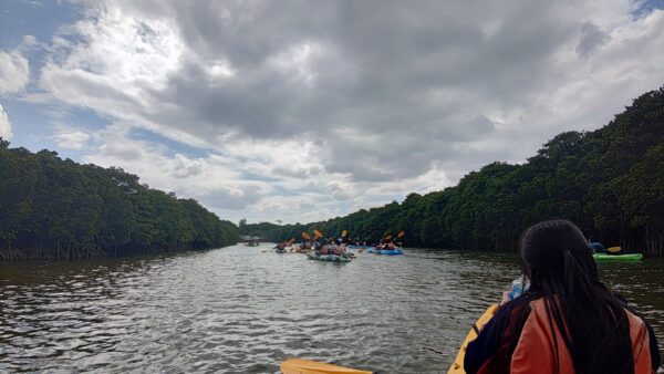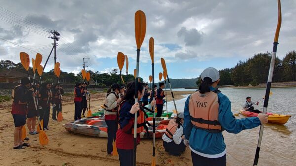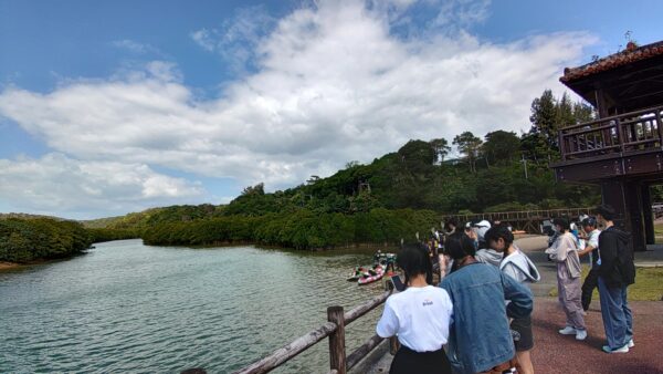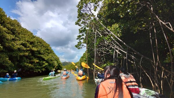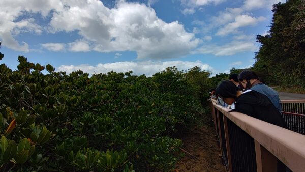 研修参加者20名は、今日も元気に沖縄の自然環境・文化の研修に挑みます。最初に、東村ふれあいヒルギ公園に向かいます。昨日から強風が吹いていて心配だったのですが、予定通りカヌーを使って水辺側から、遊歩道を使って陸地側から、それぞれの視点でマングローブの観察をすることができました。